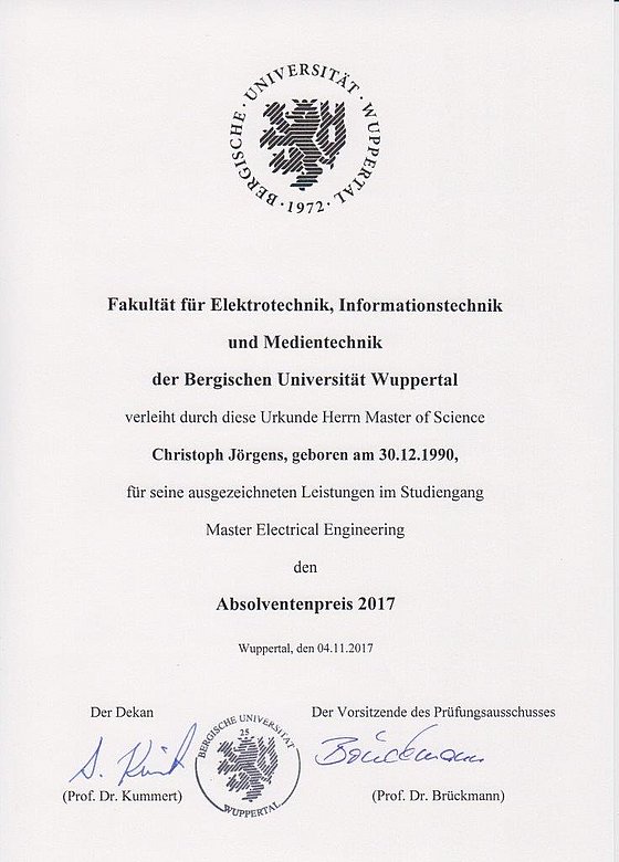 Graduate Award 2017 for Mr. Christoph Jörgens M.Sc. from the Faculty of Electrical Engineering, Information Technology and Media Technology at the University of Wuppertal for his excellent performance in the Master Electrical Engineering course of study.