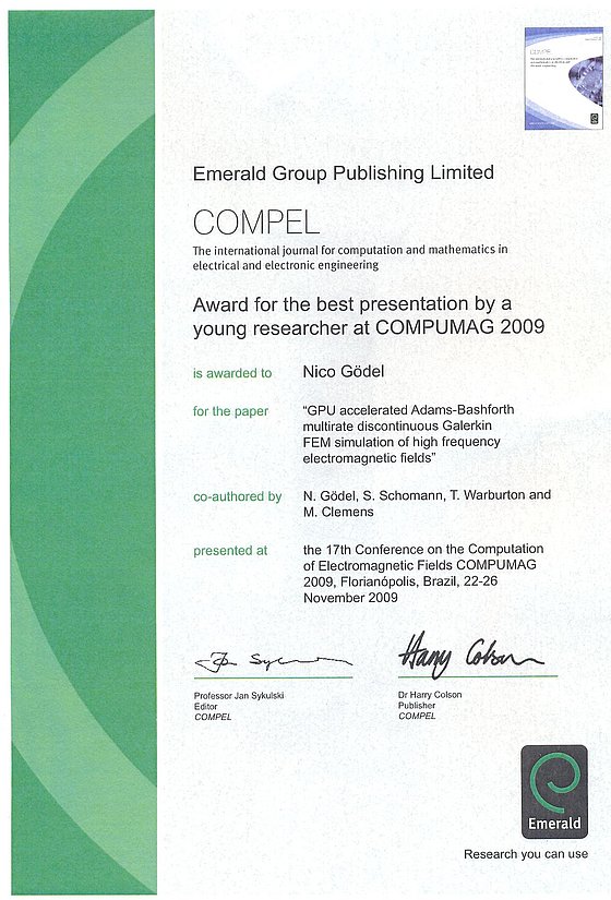 Steffen Schomann was awarded as one of the six finalists in the category for the best paper by a young researcher at 17th Biennial Conference on Computation of Electromagnetic Field (COMPUMAG 2009) held in Florianopolis, Brazil, from November 22nd - 26th, 2009.