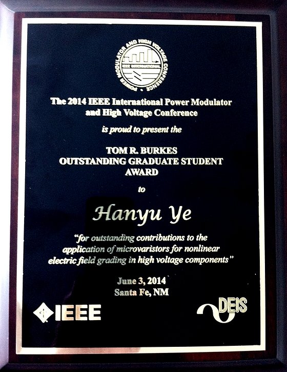Hanyu Ye was awarded with the Tom R. Burkes Outstanding Graduate Student Award for outstanding contributions to the application of microvaristors to nonlinear electric field grading in high voltage components at the IPMHVC 2014