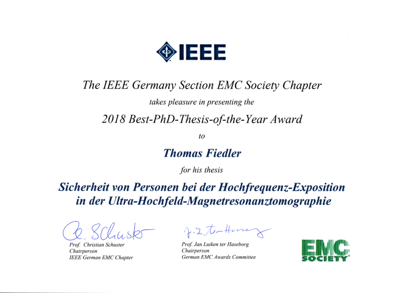 Thomas Fiedler was awarded the 2018 Best PhD Thesis of the Year Award by the IEEE Germany Section EMC Society Chapter