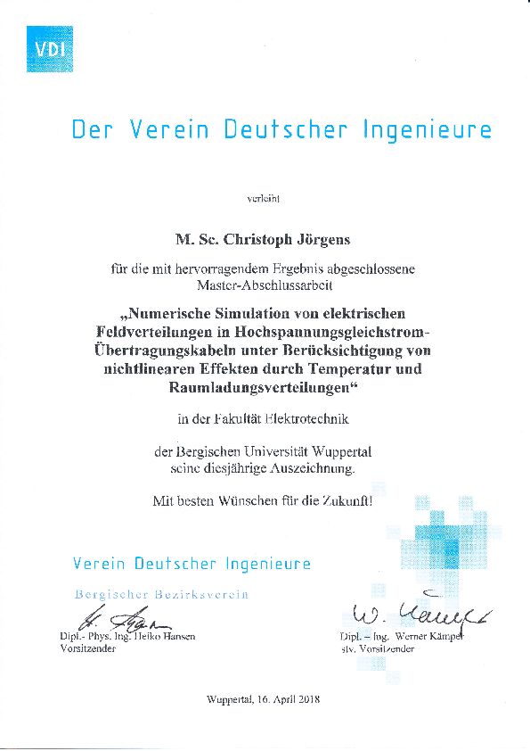 Award for Mr. Christoph Jörgens, M.Sc., at the 148th annual general meeting of the VDI-Bergischer Bezirksverein for his master thesis "Numerische Simulation von elektrischen Feldverteilungen in Hochspannungsgleichstrom-Übertragungskabeln unter Berücksichtigung von nichtlinearen Effekten durch Temperatur- und Raumladungsverteilungen".